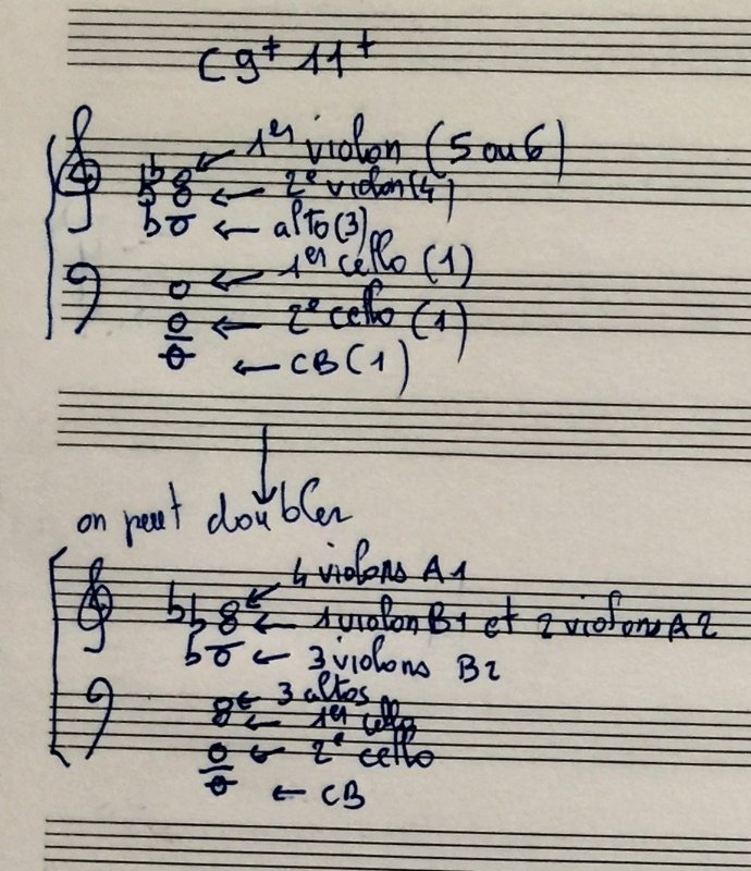 Bien sûr, maintenant, avec les logiciels, on peut mixer, en faisant ressortir au besoin certaines voix par rapport à d'autres) afin d'obtenir quelque chose d'équilibré. Mais si jamais on doit faire jouer notre arrangement par un véritable orchestre (en l'occurrence ici une section de cordes), il faut s'assurer d'avoir pris quelques précautions.