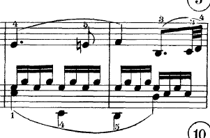 Où là on voit distinctement l'écriture à 3 voix : basse (noires à la main gauche), texture de batterie en double croches) et mélodie, le tout réparti sur les deux mains.